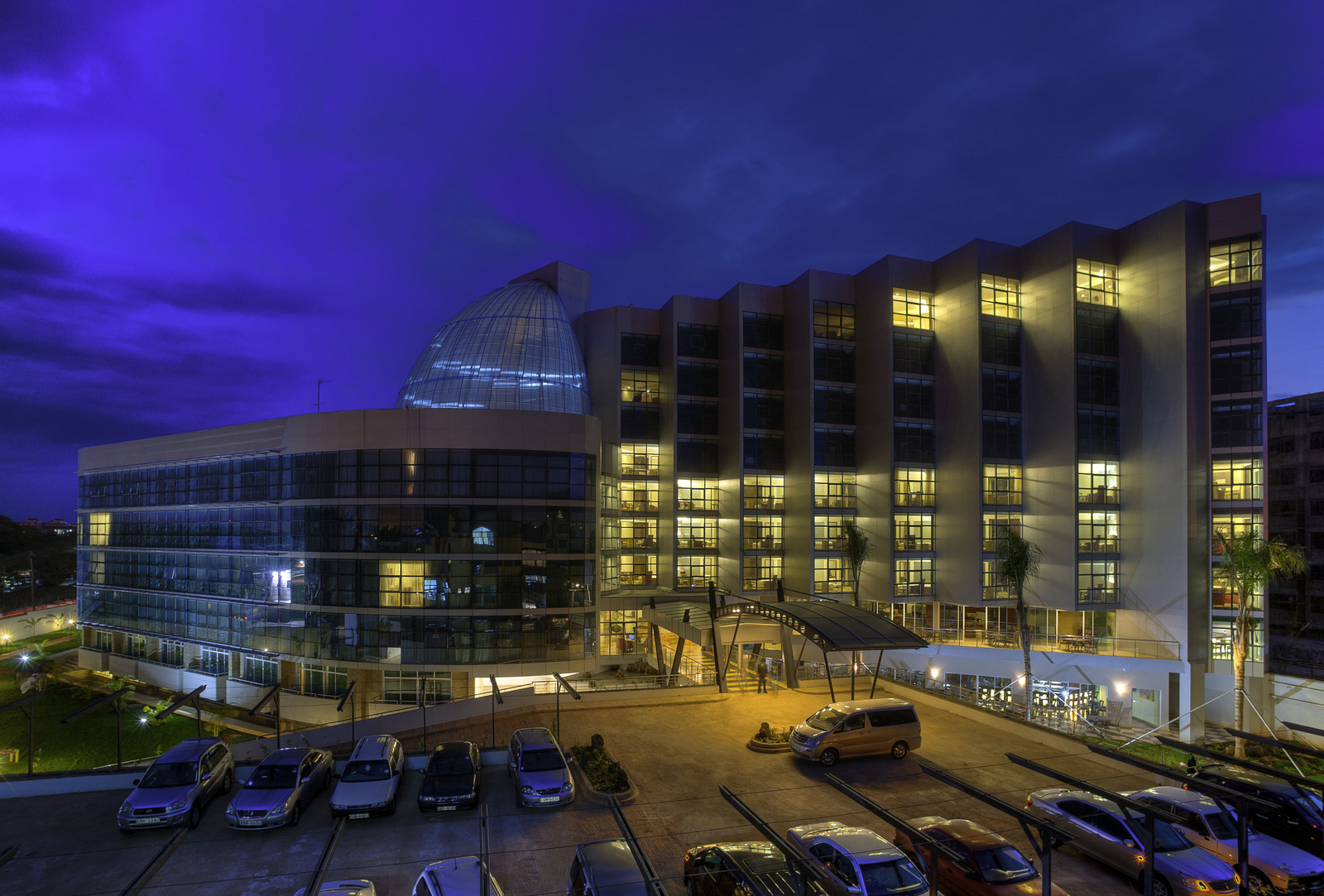 The exterior illuminated at night at The Boma Nairobi, Nairobi, Kenya