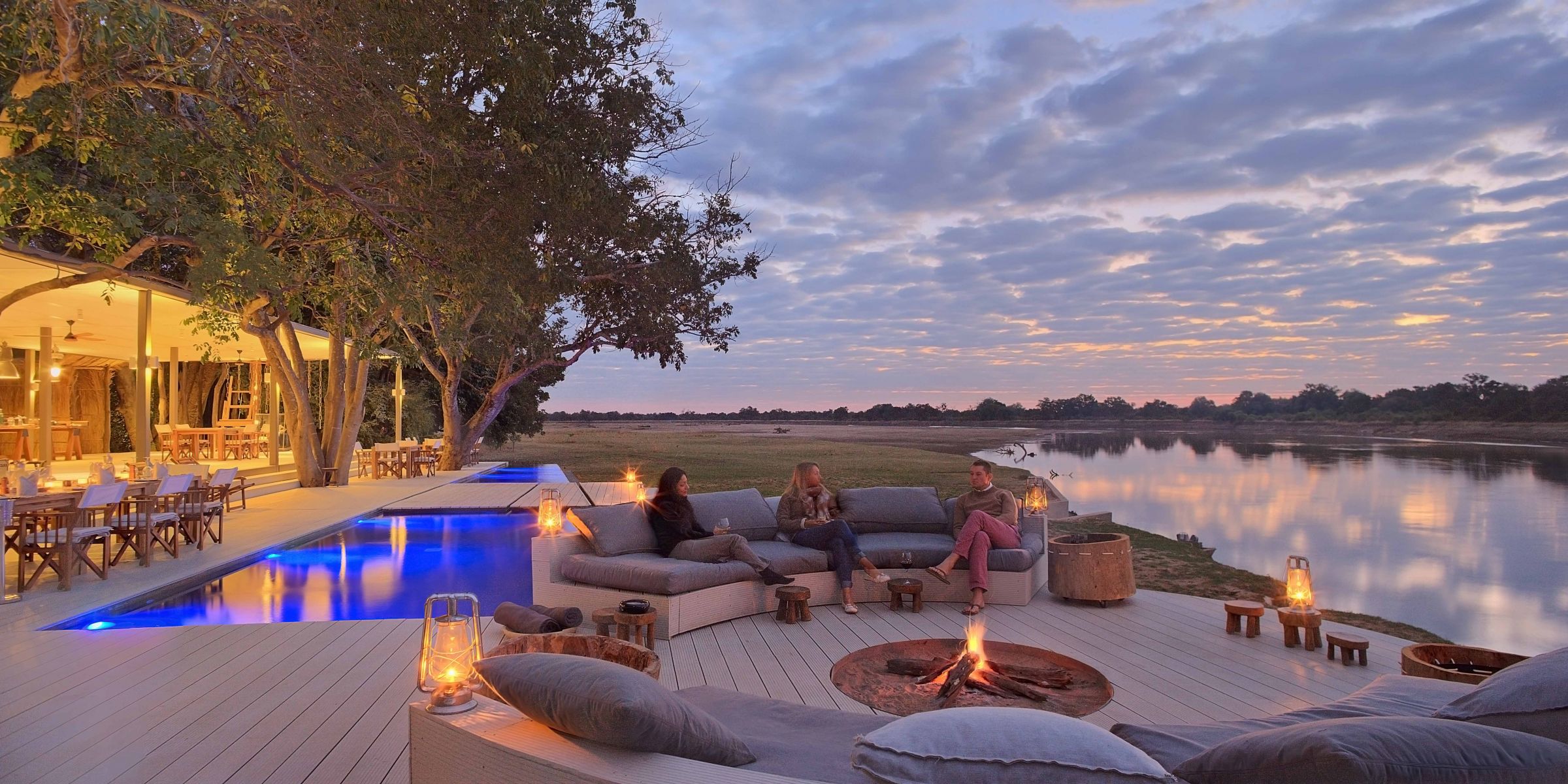 Sit around a campfire on the main deck overlooking the river's wildlife at Chinzombo, South Luangwa National Park, Zambia