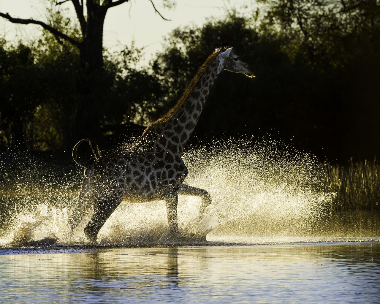 Giraffe running through the wetlands at Duma Tau, Linyati Wetlands, Botswana (Dana Allen)