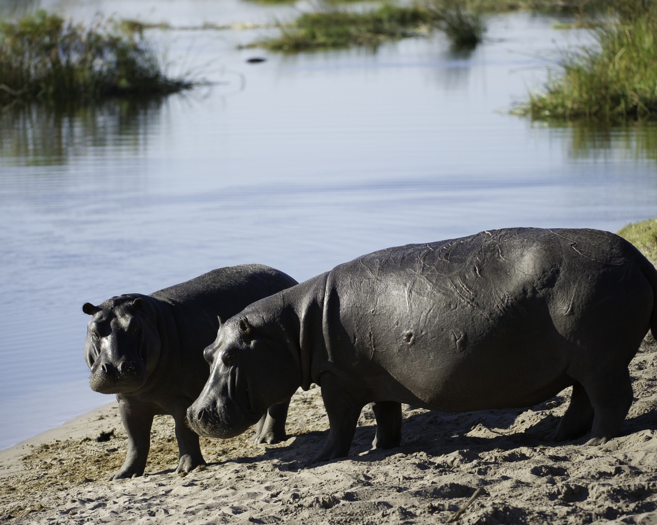 Hippos on the bank of the wetlands at Duma Tau, Linyati Wetlands, Botswana (Dana Allen)