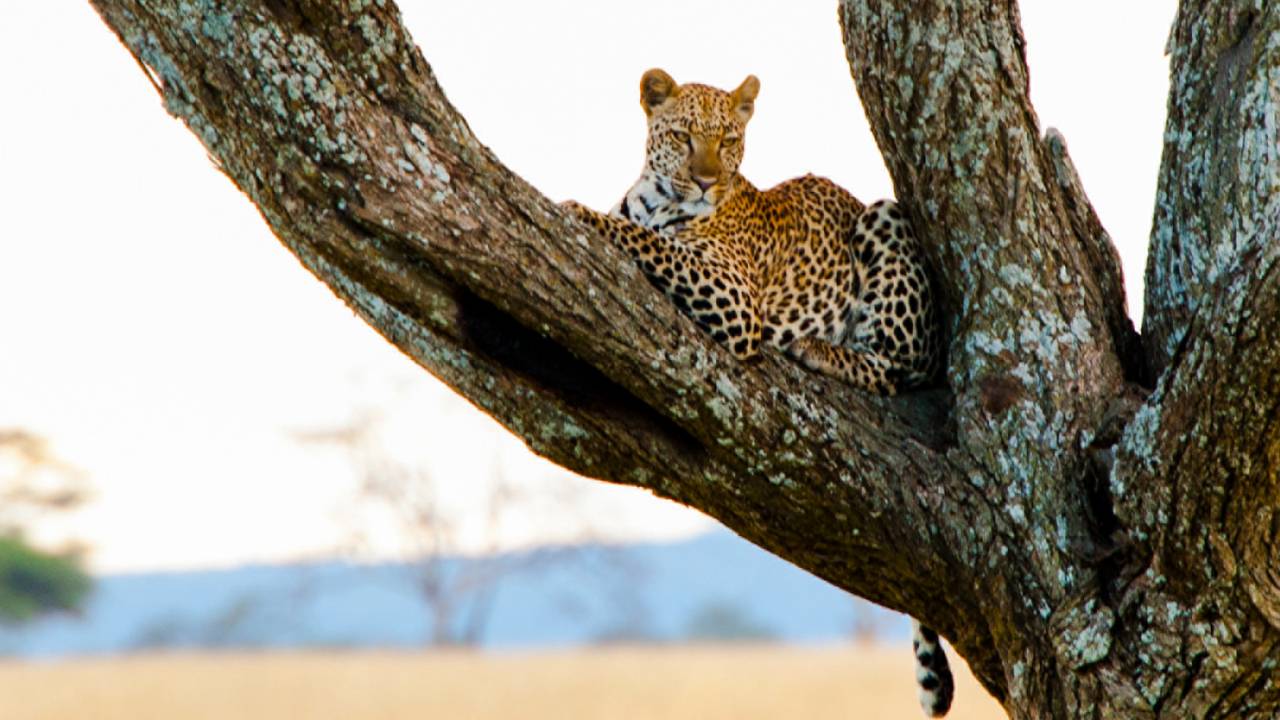 A beautiful leopard relaxes in a tree at The Four Seasons Safari Lodge, Serengeti National Park, Tanzania