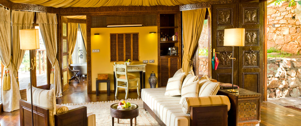 Private lounge in suite at Kasbah Tamadot, Atlas Mountains, Morocco