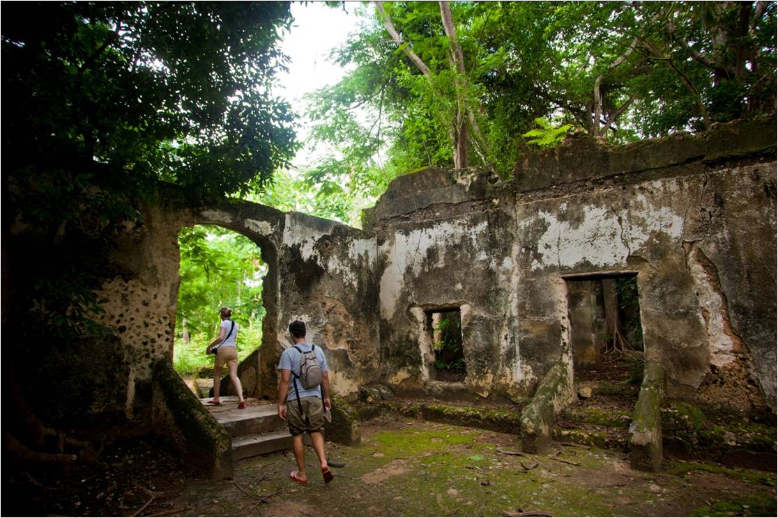 Ruins overgrown by the jungle make for a magical setting to hike at Kinasi Lodge, Mafia Island, Tanzania