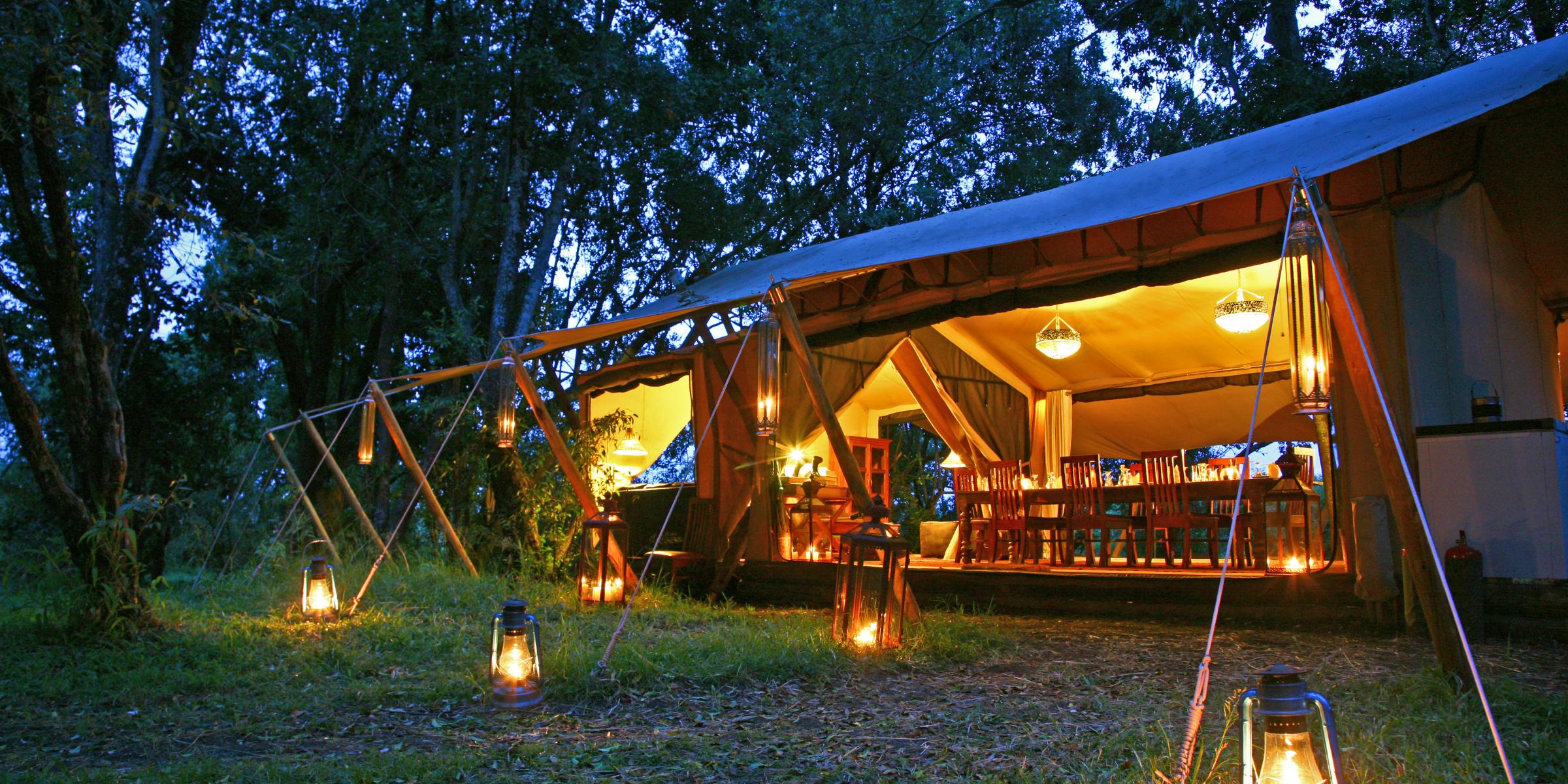 The main tent glows at dusk at Mara Toto Camp, Masai Mara National Reserve, Kenya