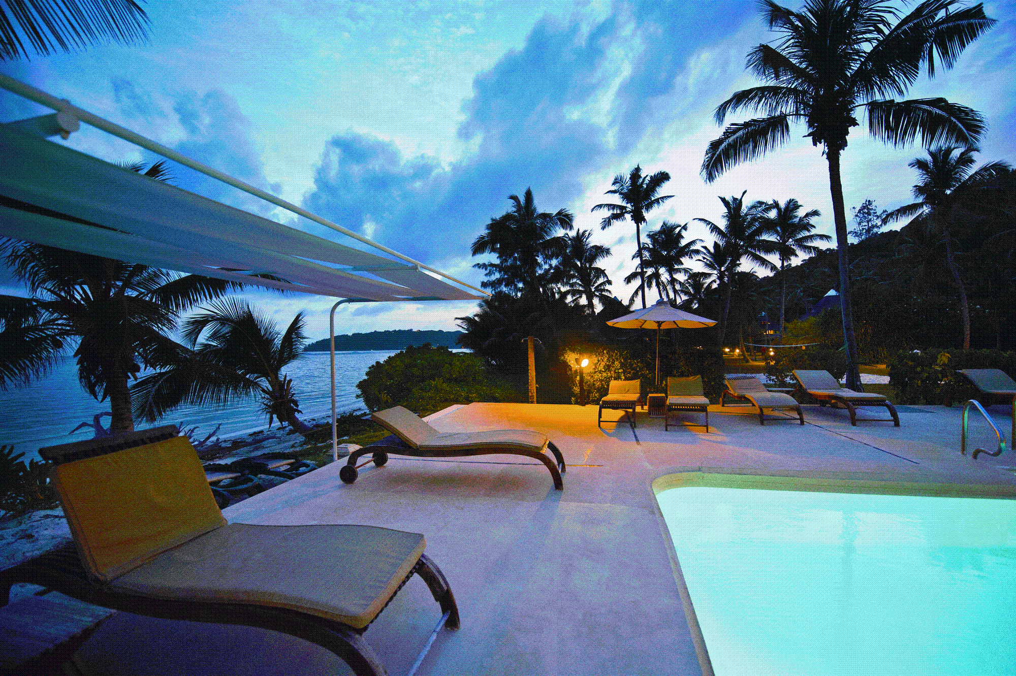Sun loungers by the pool at New Emerald Cove, Praslin, Seychelles