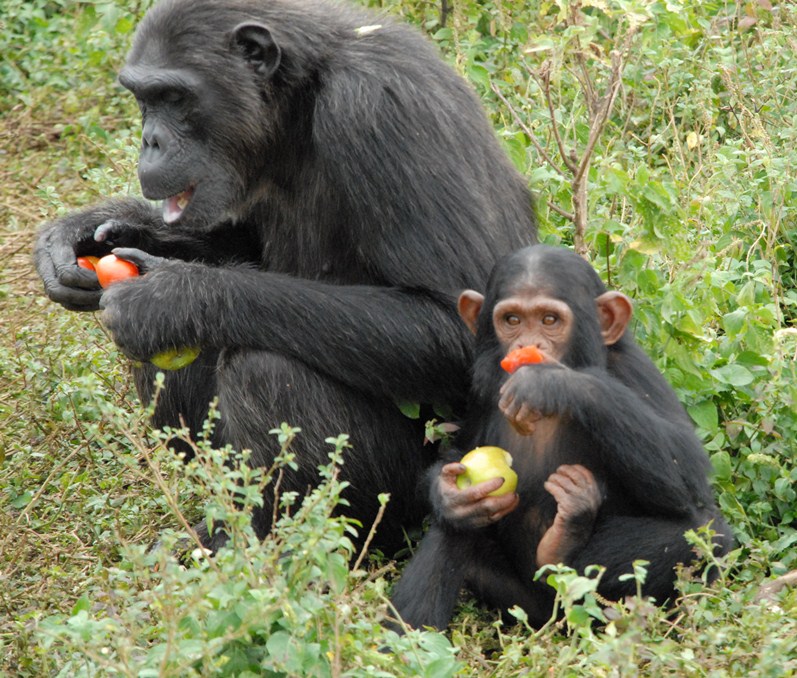 A mother chimp and her baby eating at Ngamba Island Tented Camp, Ngamba Island, Uganda