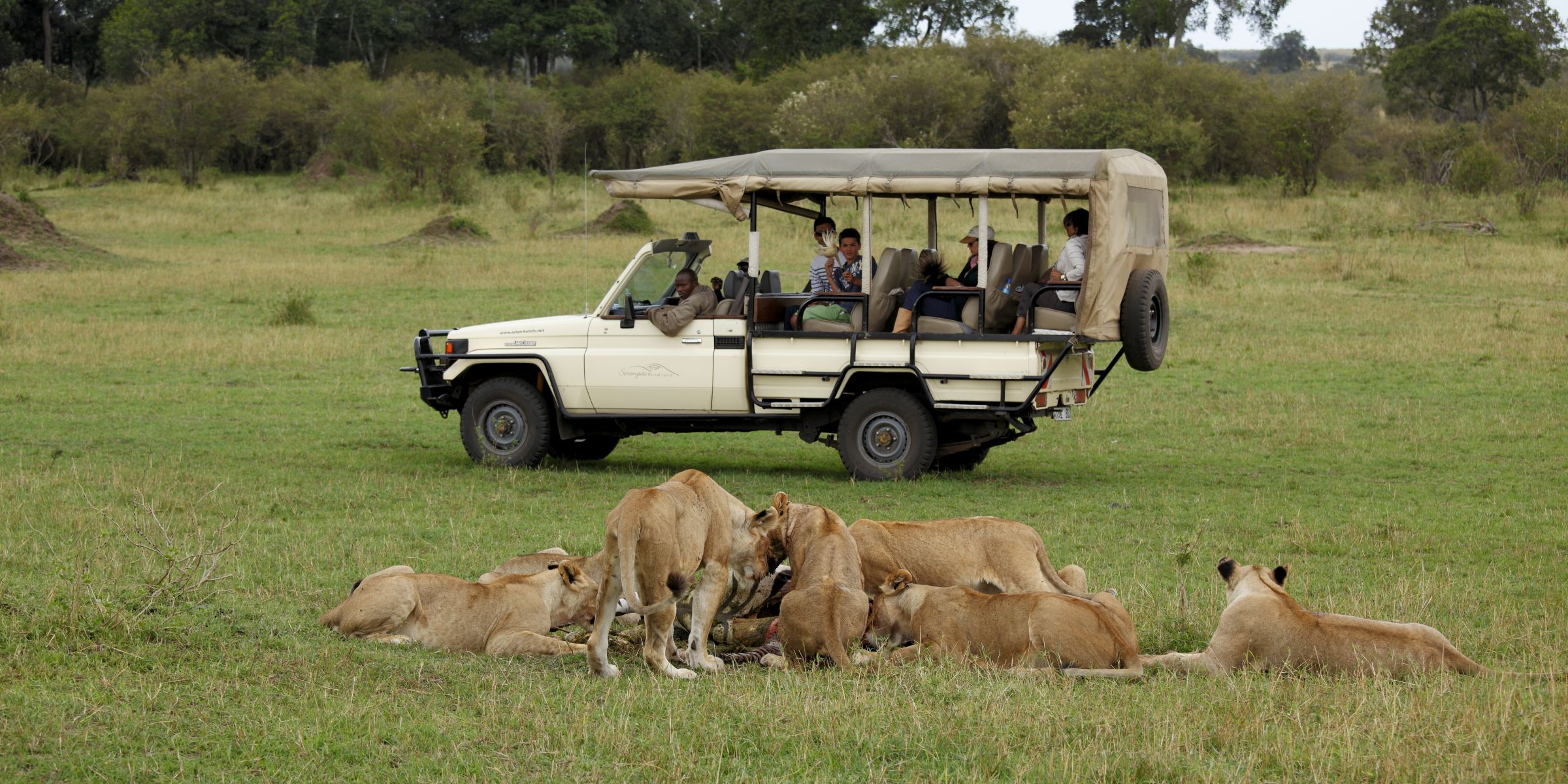 A game drive watches as lions feedr at Serengeti Bushtops Camp, Serengeti National Park, Tanzania