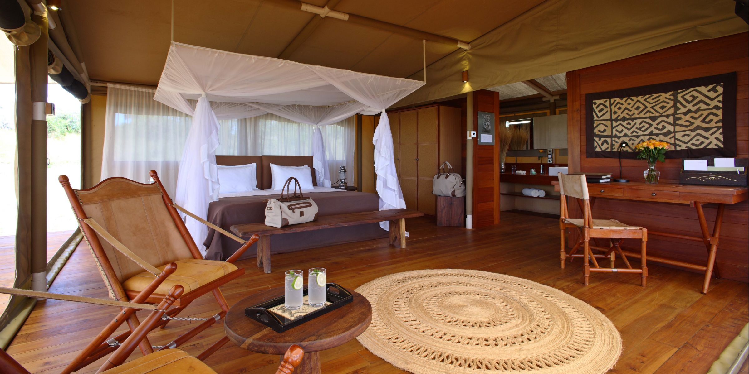The luxurious bedroom with elements of African and Victorian-inspired decor at Serengeti Bushtops Camp, Serengeti National Park, Tanzania