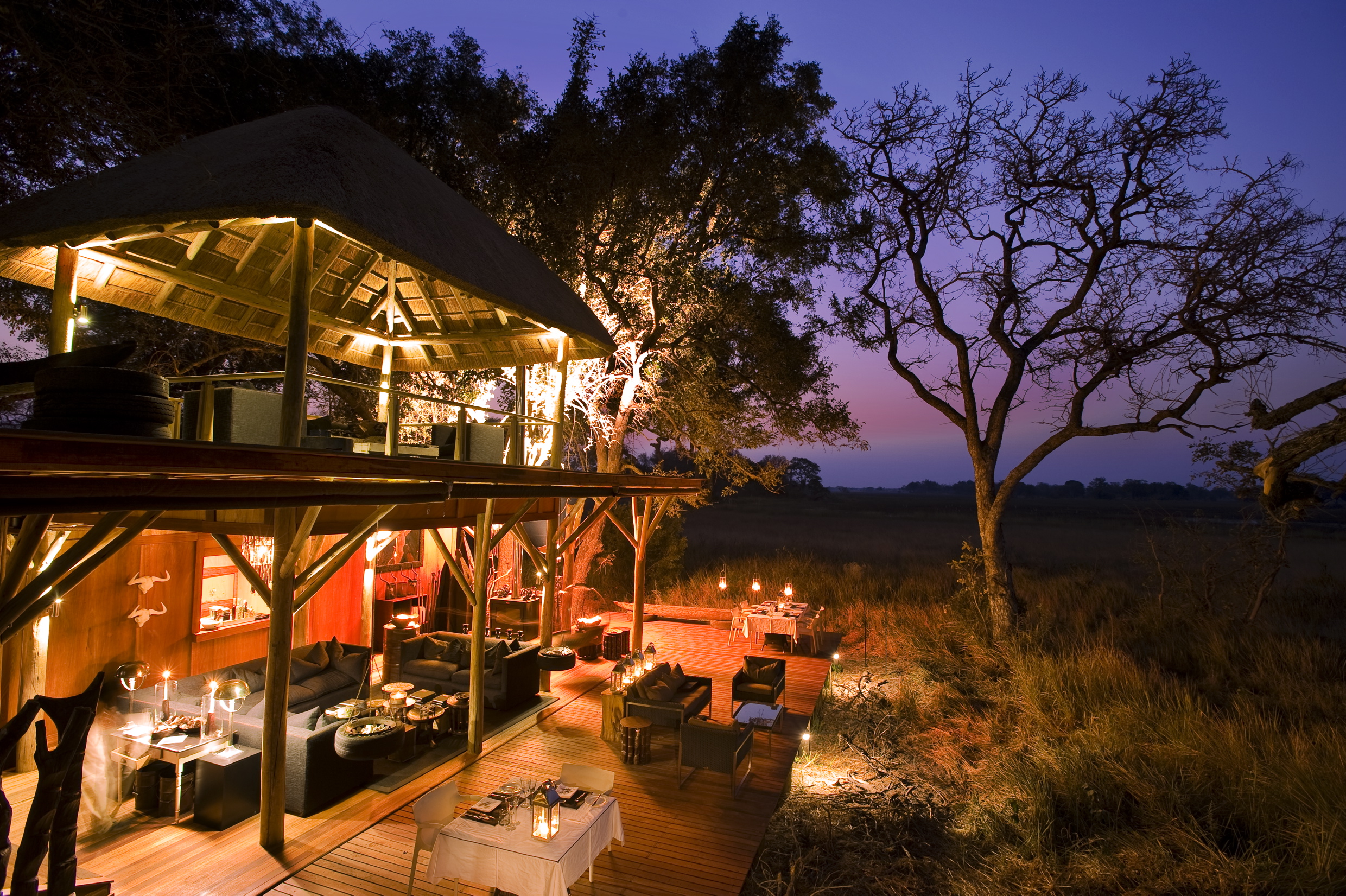 Veranda and exterior of lodge at Xudum Okavango Delta Lodge, Okavango Delta, Botswana (AndBeyond)
